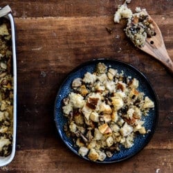 Pretzel Bread Quinoa Stuffing with Garlic Butter Mushrooms.