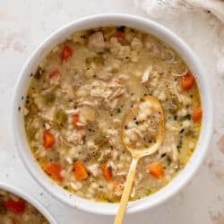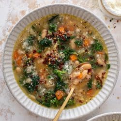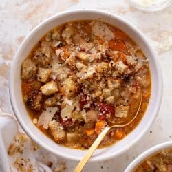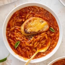 Tomato Orzo Soup with Crunchy Cheddar Toasts.