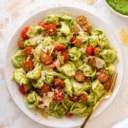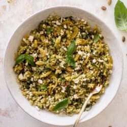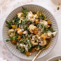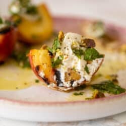 Grilled Peaches with Burrata and Pistachio Herb Vinaigrette.