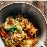 - Serve the spaghetti in deep pasta bowls topped with a scoop of cheesy crispy zucchini and more fresh basil. Mwah.