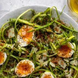 Shaved Parmesan Asparagus with Soft Boiled Eggs and Crunchy Brown Butter Breadcrumbs.