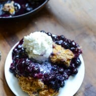 Skillet Blueberry Cobbler with a Cheddar Biscuit Crust.