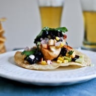 Sweet + Spicy Glazed Chicken, Corn + Avocado Tostadas with Blueberry Peach Salsa.