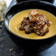 Bourbon Sweet Potato Bisque with Brown Butter Cinnamon Sugar Croutons.