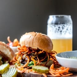 BBQ Havarti Burgers with Sweet Potato Curly Fries.
