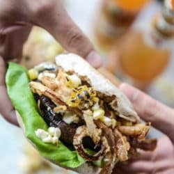 Blue Cheese Stuffed Portobello Burgers with Grilled Corn and Crispy Shallots.