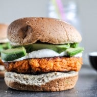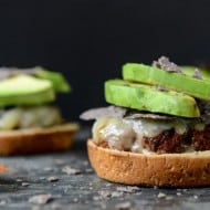 Smoky Sweet Potato Burgers with Roasted Garlic Cream and Avocado.