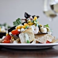 Summertime Seafood Nachos with Grilled Corn + Avocado Cream.