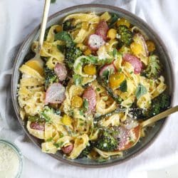Roasted Spring Vegetable and Goat Cheese Fettuccine.