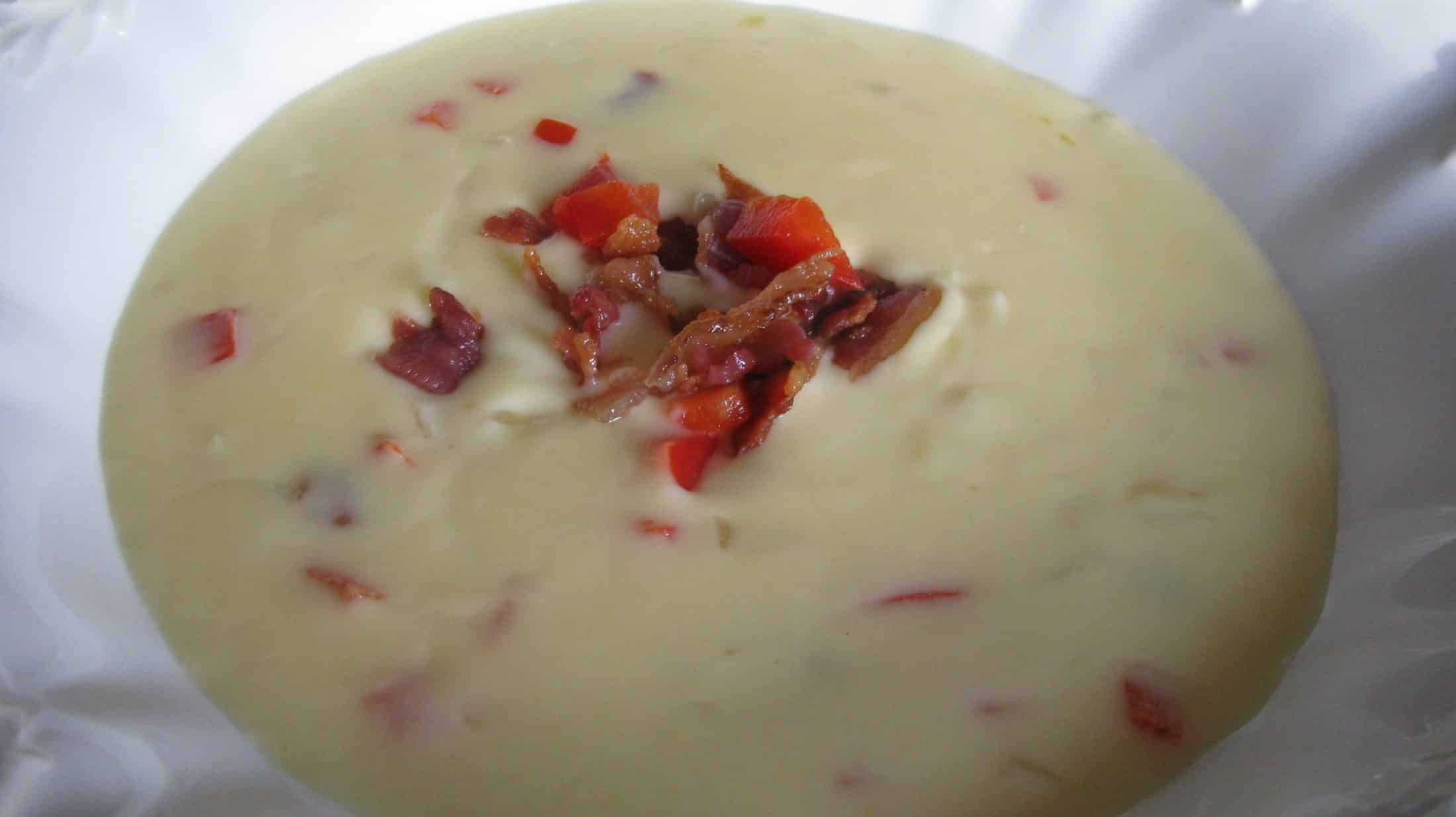Comforting Cheese Soup with Red Pepper and Bacon.