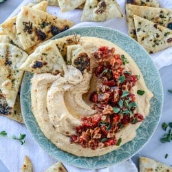 Hot Bacon Cherry Pepper Hummus with Pizza Pita Chips.