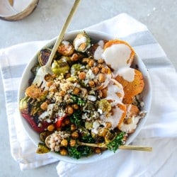 Grain Bowls with Maple Chipotle Brussels and Coconut Roasted Sweet Potatoes.