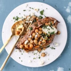 Slow Roasted Sweet Potatoes with Spicy Garlic Chickpeas and Blue Cheese Sauce.