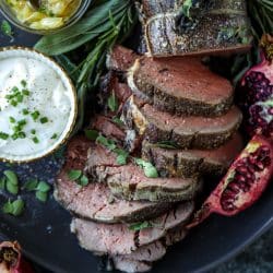 Herb and Butter Roasted Beef Tenderloin with Horseradish and Caramelized Onions.