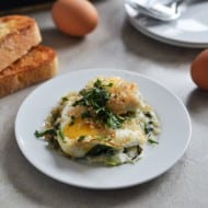 Fontina and Spinach Baked Eggs with Garlic Brown Butter Breadcrumbs.