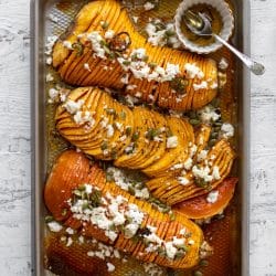 Hot Honey Hasselback Butternut Squash with Feta and Pepitas.