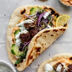 Chicken Meatball Pitas with Roasted Red Pepper Whipped Feta.