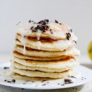 Whipped Ricotta Pancakes with Bittersweet Chocolate and Lemon Glaze.