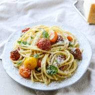 Roasted Garlic Butter Bucatini with Burst Cherry Tomatoes.