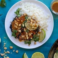 Salmon with Thai-Style Curry Peanut Sauce and Coconut Cilantro Rice.