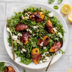 Grilled Prosciutto Wrapped Peaches with Arugula & Goat Cheese.
