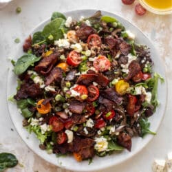 Mushroom Bacon Blue Burger Salads with Warm Dijon Vinaigrette.