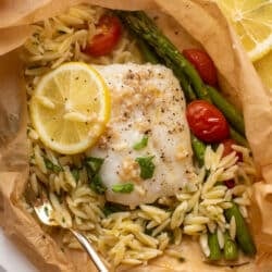 Lemon Garlic Butter Orzo and Fish Parchment Packets.