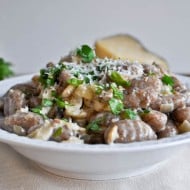 Crispy Shrimp Pasta with Arugula Pesto Cream Sauce.