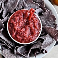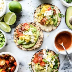 Sweet + Spicy Glazed Chicken, Corn + Avocado Tostadas with Blueberry Peach Salsa.