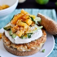 Shrimp Burgers with Chipotle Cream and Coconut Peach Salsa.