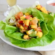 Beer Battered Shrimp Lettuce Wraps with Mango Avocado Salsa.