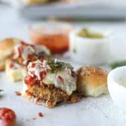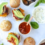Grilled Veggie Sliders with Goat Cheese Spread and Roasted Red Pepper Vinaigrette.
