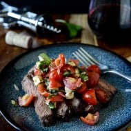 Red Wine Marinated Flank Steak with Cherry Tomato Caprese Salsa.