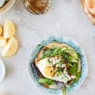 Crispy Egg Tostadas with Lemon Greens and Toasted Sesame Oil.