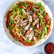 Thai-Style Drunken Zucchini Noodles with Spicy Honey Chicken.