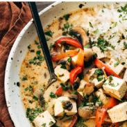 Instant Pot Instructions: Press the Sauté button on the Instant Pot and heat the oil. Then, sauté the garlic, ginger, and lemongrass for 2-3 minutes until soft-ish. Add the roasted red chili paste and sauté for another minute. Then, add in the tofu and 4 cups of broth. Place the lid on the pot and cook on Manual mode (high pressure) for 3 minutes. Quick release the steam using the valve. Stir in the coconut milk, fish sauce, brown sugar, lime juice and zest, and salt. Add in the mushrooms and red pepper. If you feel like it could use more liquid, you can add an additional cup of broth if needed. Press the Sauté button again to simmer the veggies for 5-6 minutes until softened. Pull out the lemongrass chunks and stir in the cilantro.