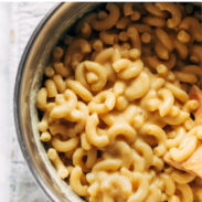 Instant Pot instructions: Add macaroni, 1 1/2 cups of water, and a pinch of salt to the Instant Pot. Cook for 3 minutes on high pressure. Use the Quick Release function to release the steam. Uncover and add in 1/2 cup non-dairy milk, 3 tablespoons of “cheese” powder, non-dairy butter, and stir. If the macaroni seems too liquidy, let the macaroni cook for a minute on the Sauté function until it begins to boil. Press cancel and give it a good stir. The macaroni will thicken as it sits. If the macaroni needs more milk, add in 1/4 cup at a time.