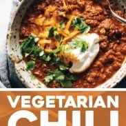 Toppings: For vegetarian chili – sour cream and cheddar or queso fresco. For vegan chili – cilantro, avocado, pickled onion or jalapeno, radishes, tortilla chips.